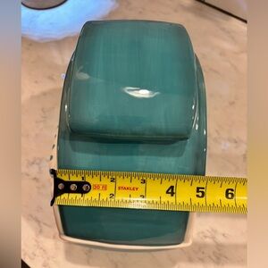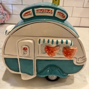 Charming ceramic camper toy in teal and white with orange accents. Perfect for imaginative play and decoration. Super cute whimsical cookie jar!