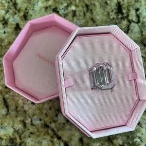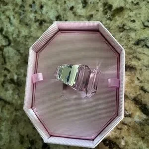 Style: Cocktail ring with an octagon-cut pink crystal set atop a crystal band (“crystal on crystal” design) with a tonal metal inlay for a seamless, sculptural profile