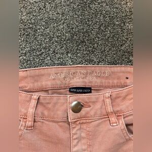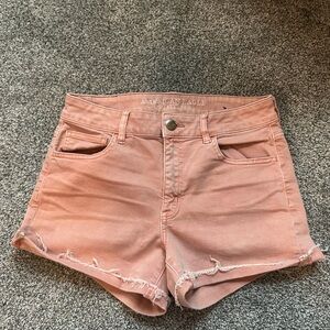 These pink shorts from American Eagle Outfitters offer a classic denim look with a modern twist. Featuring a soft, faded texture and a stylish rolled hem, they are perfect for casual outings. The shorts are crafted with quality materials, ensuring both comfort and durability. Light pink colored. High rise super super stretch style. Size 8. Includes 4 pockets, 2 front pockets and 2 back pockets. Zipper to close in the front.