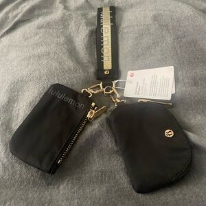 Sleek black wristlet with dual pouches. Ideal for small essentials. Features signature Lululemon logo.