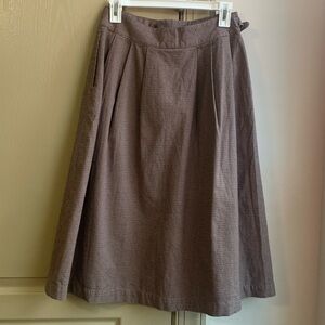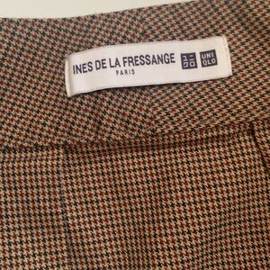 Chic brown houndstooth brown and tan midi skirt by Uniqlo x Ines De La Fressange. Features a stylish A-line cut, belt, and pockets. Ideal for versatile styling.