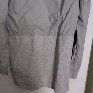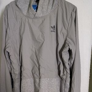The Adidas Gray Windbreaker size M is crafted for those who value both style and functionality. Made from a smooth, water-resistant material, this lightweight jacket is perfect for outdoor activities. Its minimalist design and full-zip front ensure a sleek look and easy wear. It does have a small stain on the bottom right side. (see pictures). Material: 70% Cotton, 30% polyester, overlay 100% nylon, hood 100% Cotton. Measurements: Length: 29' in., chest (armpit to armpit): 22' in., arm length: 25.5' in.