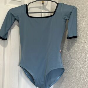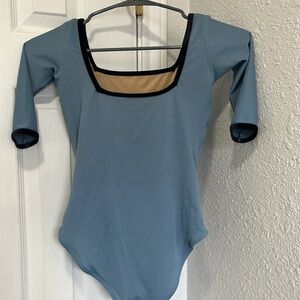 Yumiko Marieke leotard half sleeve full front lining techni fabric ( an antique blue/grey mix color) black velvet trim, size small excellent condition