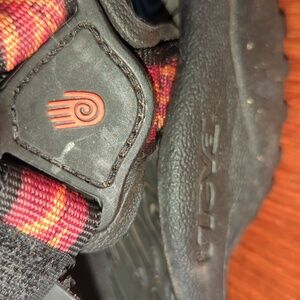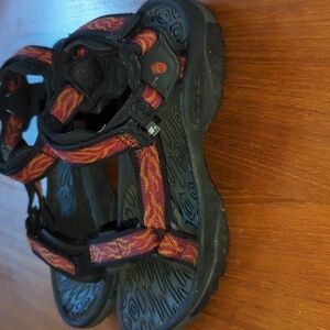 Size 9 Teva sandals, adjustable straps at ankles and over ball of foot. Black sole with rust/gold tapestry straps. Good used condition, sole has spots of dry paint but doesn't effect wear.