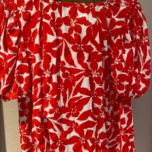 LOFT Plumeria puff sleeve blouse, featuring a vibrant red and white pattern. The relaxed fit and soft fabric ensure comfort, while the blouse sleeve length adds a touch of sophistication. Perfect for a casual yet chic look. 100% cotton.