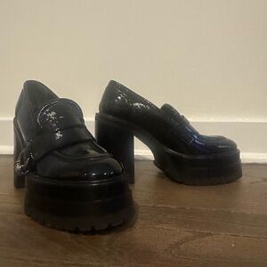 Stylish black clogs with tan wooden heels. Features a sleek design and studded accents.