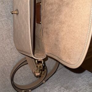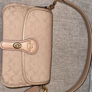 Signature canvas and smooth leather Inside multifunction pockets Turnlock closure fabric lining Detachable handle with 9 1/2 drop Outside slip pocket Detachable strap with 20 drop for shoulder or crossbody wear 9 3/4 (L) x 6 (H) x 2 3/4 (W) Exclusive of trim this piece is crafted of cotton sourced from farms that use regenerative agricultural practices—those that help to maintain and rejuvenate land increase biological diversity and soil health and could lead to increased carbon absorption Style No. CAK49