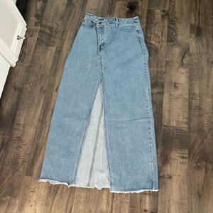 Chic light blue denim maxi skirt with front slit. Perfect for casual outings.
