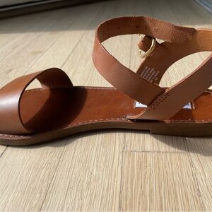Stylish tan leather sandals by Steve Madden. Features adjustable ankle strap. Never worn.