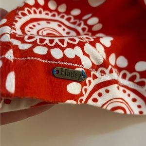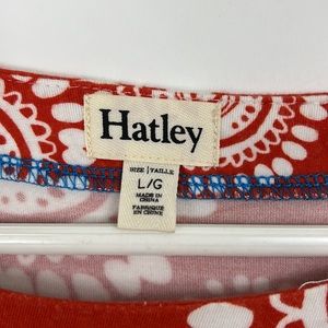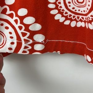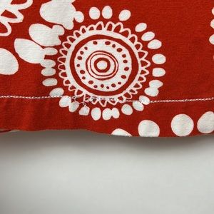 EUC HATLEY jersey-like mini dress with white medallion print on red. 95% viscose 5% spandex. Loose threads at hem; see photos. Wash inside out by hand in cold; towel dry then lay flat. 3/4 sleeves, boat neck. Very soft and funky dress! Approximate Measurements (laying flat): bust: 18” length: 36” pit to cuff: 10.5” waist: 17”