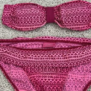 Stylish bikini set featuring a pink top and bottom with a tropical print alternative. Perfect for beach days.