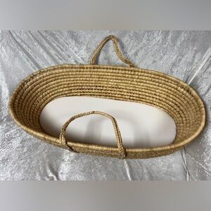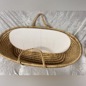 Comes with rattan basket, white mattress and a beige mattress cover.