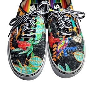 Vans, Crayola, tropical, parrot, collab, rainbow, colorful, low top, size 10, size 8.5, unique print, limited edition, art shoes, artsy, multicolor, casual, skater, canvas, striped insole, collectible, fashion sneakers, bold design, jungle print, bold, vibrant, teacher shoes, back to school shoes, elementary school attire