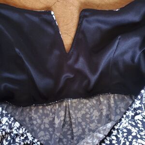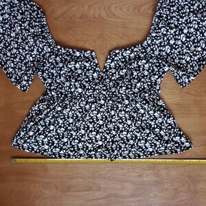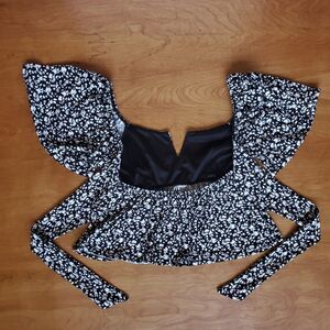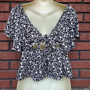 Ditsy Floral Top Size S Black White Flutter Sleeve Tie Back Empire Waist Cottage