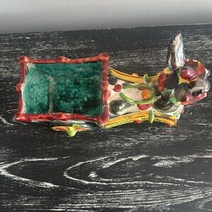 Vintage Italian donkey pulling cart flower planter. There are issues with donkey’s ears. Looks like they may have been broken and glued back in place. Also the hat is chipped in front. See all photos. It’s still fabulous and fun and vintage from At least 1950s