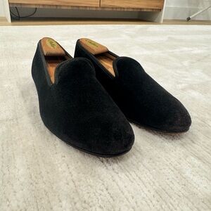 Experience timeless elegance with Tricker's Black Loafers, designed for those who appreciate minimalist style. These slip-ons feature a streamlined silhouette and a rounded toe, crafted from premium materials for a sophisticated look. The black color ensures versatility, making them perfect for both casual and formal occasions. Enjoy the comfort and quality that Tricker's is renowned for. Light signs of wear/discoloration.