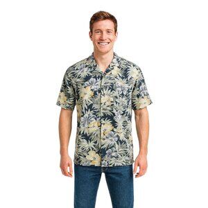 Step into island style with this classic Tommy Bahama short sleeve Hawaiian shirt in size Large. Featuring a vibrant yellow, cream, and lavender floral print on a dark navy base, this 100% rayon shirt offers a soft, breezy feel perfect for summer, vacations, or luau parties. Crafted in Hong Kong with quality stitching, coconut-style buttons, and a relaxed fit, it’s a timeless resortwear staple.