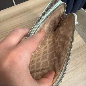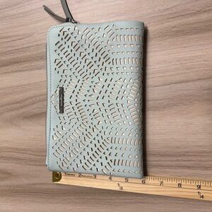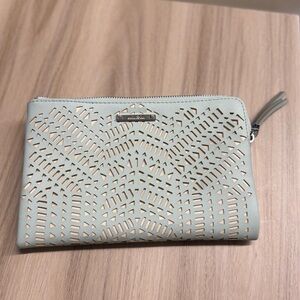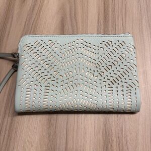 This elegant clutch features a stylish cutout design, perfect for any occasion. The light mint green color adds a touch of sophistication to your outfit. Has a cardholder area. Very good condition.