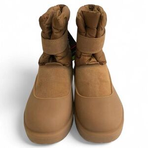 Experience ultimate warmth and comfort with UGG's tan winter and rain boots. Featuring a quilted, puffy upper and a thick rubber sole, these boots are perfect for braving cold and wet conditions. The slip-on design and padded collar ensure easy wear and a snug fit. Slip on soles (which can be sold separately!) are perfect to ensure they stay dry & waterproof in the winter!