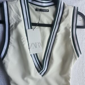 NWT Zara White and Green Bodysuit with V-Neck and Athletic Cut.