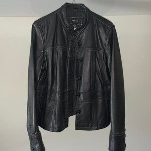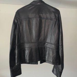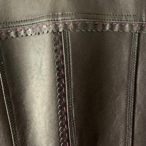 Adorable quality leather jacket that has never been worn, doesn't have any tags though. Notice all the beautiful details, including purple stitching on some of the edges. No rips, stains or damage found. Smoke- and pet-free home.