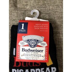 Listing includes 3 pair of socks. (1) Navy Blue with Bud Light "I Love Bud Light" print, (1) Black with hand holding beer bottle print, Black with Budweiser "I Make Buds Disappear What's your Super Power?" print.