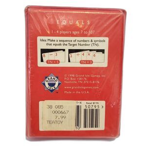 The game adjusts easily to different ages and abilities. For example, here's a 7-card hand where the target number was 2: 1 2 ÷ 4 8 x 8. Notice the use of multi-digit numbers as well as a fraction. Parentheses can also be used and for serious students of mathematics the "Order of Operations" principle can be followed. There is also a solitaire version of EQUALS.