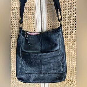 Black leather crossbody bag with adjustable shoulder strap. Tons of pockets. Really cute!