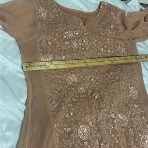 Shalwar kameez duppatta in peach georgette embroidery sequins. Geoegette fabric. Sharrara ghagra style trousers. 3 piece complete suit. Size S. Approximate measurments shown in pictures. Stylish indian pakistani wear for weddings or special events. Beautiful hanging beads in front. Pearl buttons. Side zip on left of kurta. Duppatta edging done all corners with lace. Self embroidery and sequins georgette fabric. Nice long scrunch style sleeves. This is a 3 piece suit in as is in a pre owned condition with signs of wear.