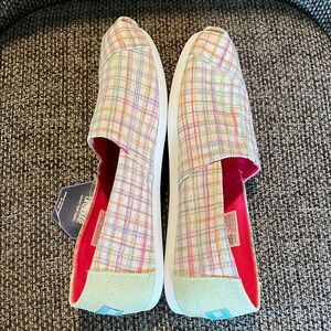 Vibrant slip-ons with multicolor plaid pattern. Features 'LOVE' embroidery and bright interior.