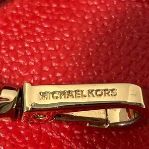 Stylish and compact Michael Kors mini tote in bold red pebbled leather with gold-tone MK charm. Features dual handles, an adjustable crossbody strap, and a magnetic snap closure. Interior lined with MK monogram fabric. Perfect for essentials — great for a night out or everyday use!