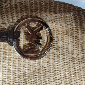 Branding: A prominent gold-tone "MK" logo charm hanging from one of the handles.