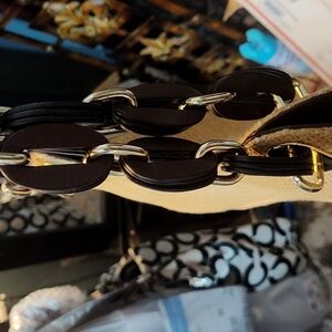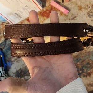 Handles: Braided brown leather handles with gold-tone hardware, including a chain-link detail.