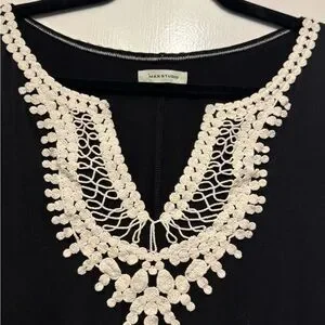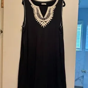 Elegant black sleeveless dress featuring intricate cream lace detail on the neckline. Bought from Stitch Fix.