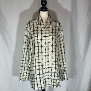 **Please review measurements before making purchase! This shirt is meant to be oversized so please consider that when considering the measurements. Also, please notice the small imperfection along the collar (makeup?) I haven’t dry cleaned this top, so it very likely will come out if it is dry cleaned. Otherwise this top is in perfect shape and it’s ready to go home with you!**