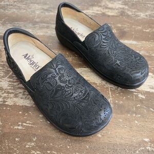 ALEGRIA black slip-on shoes with embossed design. Perfect for health care workers on their feet all day!
