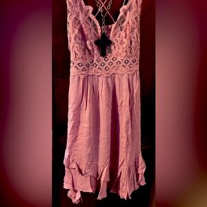 BNWT Free People rose/ blush Boho dress…❤️🔥So Stylish! 1 of Free Peoples signature dresses!🔥so many sold! Very popular style dress for FP. Too is beautiful lace design. Back top has smock stretching. Bottom is flowy w couple layers of lace. This looks great w strappy sandals. But Ecspecially cute w cowboy boots!!🔥And Jean jacket in fall. Made of viscose, cotton, nylon. Strappy straps over shoulders that cross in back. Measurements laying flat 15” with stretch. Length 32”. # freepeoplebohodress#