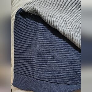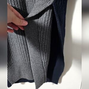 Wrap yourself in warmth and style with this oversized chunky turtleneck sweater by Moth, sold at Anthropologie. This cozy tunic-length sweater features a modern color block design with a grey front and sleeves, contrasted by a navy blue back. With its soft knit texture, side slit detail on the left, and cuffed sleeves, it's made for easy layering. The relaxed, roomy fit and longer length make it a go-to for leggings or skinny jeans. Fun bonus: it appears reversible if you'd like to show the navy side forward!