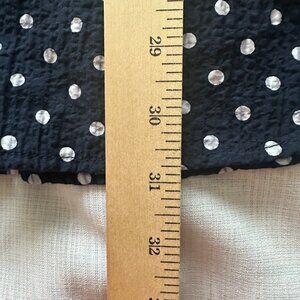 This navy polka dot blouse offers a comfortable fit with its stretchable fabric blend. The button-up design and 3/4 sleeves provide a versatile style.