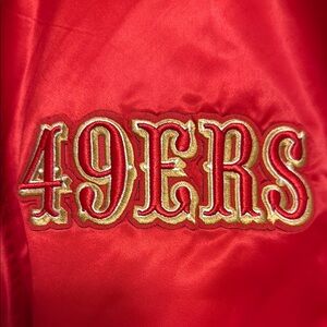 Show your team spirit with this vibrant red San Francisco 49ers bomber jacket. Perfect for game day or casual outings. Pro line 49ers jacket new with tags.
