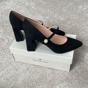New Size 7. Bandolino Black Suede Chunky Heel Mary Jane Shoes with pearl button.