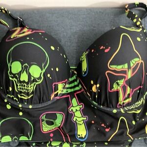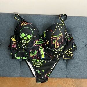 Stand out at the beach with this stylish black and green graphic bikini set. Perfect for making a bold statement.
