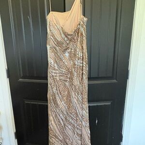 Stylish one shoulder dress. Metallic swirl pattern. Ideal for glamorous events.