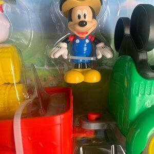 Mickey Mouse drives a green tractor with a red trailer. Includes hay bales and a chicken figure. Perfect for imaginative farm play.