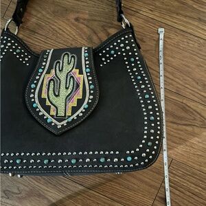 This Montana West shoulder bag combines a sleek turquoise and gray color palette with intricate studded embellishments, offering a perfect blend of style and functionality. Crafted with attention to detail, it features a structured design that complements its Western-inspired aesthetic. Ideal for adding a touch of elegance to any outfit. Concealed carry pocket on the back.