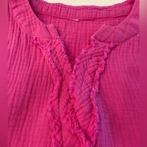 Bright pink swim coverup up or dress in a bright pink with raw hem details. This coverup dress has pockets. Brand tag and size was removed. See measurements for sizing.