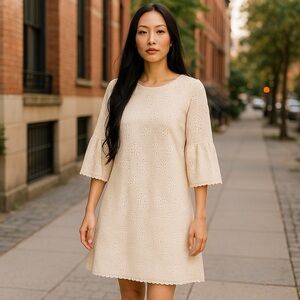 This elegant lined dress by Jessica Howard features a sophisticated cream color and a flattering crew neck. Designed with 3/4 bell sleeves, it offers a stylish touch perfect for wedding guest occasions. The intricate detail design and style adds to its unique look. The dress's minimalist design and clean lines make it a versatile addition to any wardrobe. Zip and button closure on back.