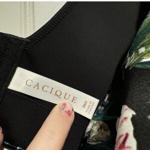 Elegant CACIQUE floral print bra with a comfortable fit. Features vibrant pink and green hues on a black background.