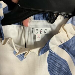 Like-new condition. Embrace a casual resort vibe with this TCEC sundress. This is a nicer boutique brand showcasing a vibrant blue and white color palette in a tropical print. The sleeveless design features flutter sleeves and a chic mock neck, perfect for a breezy summer day. The back features a button and loop closure. It is a mini-dress, hits just above my knees and I’m 5’3”. The dress is 100% polyester and is fully lined.