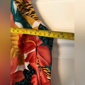 Vintage tropical dress by Diana Marco. Features vibrant floral patterns in orange π§‘ , teal π, gold π and black π€.